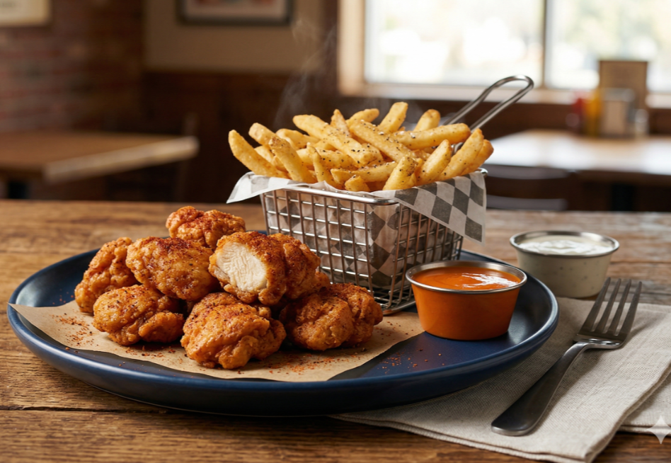 Porción de 150-200g de boneless acompañados de papas fritas crujientes. Incluyen ranch y zanahoria.