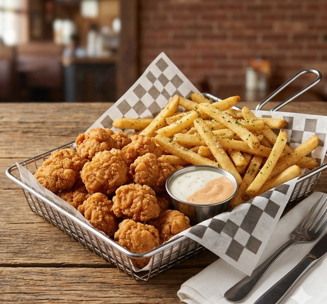 Media cubeta de boneless con generosa porción de papas. Incluyen ranch y zanahoria.