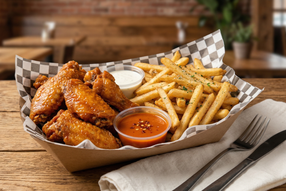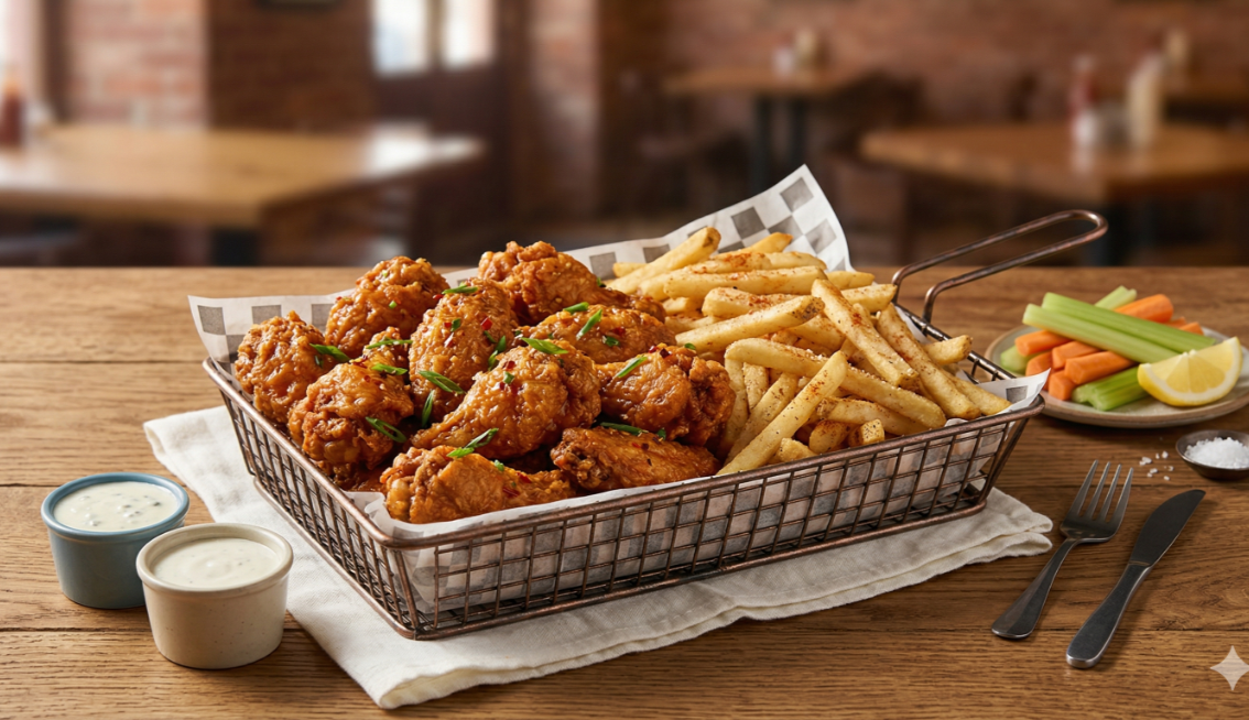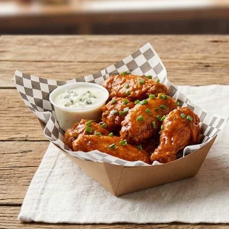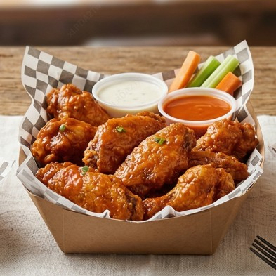 Alitas de pollo clásicas, fritas a la perfección y bañadas en salsa.