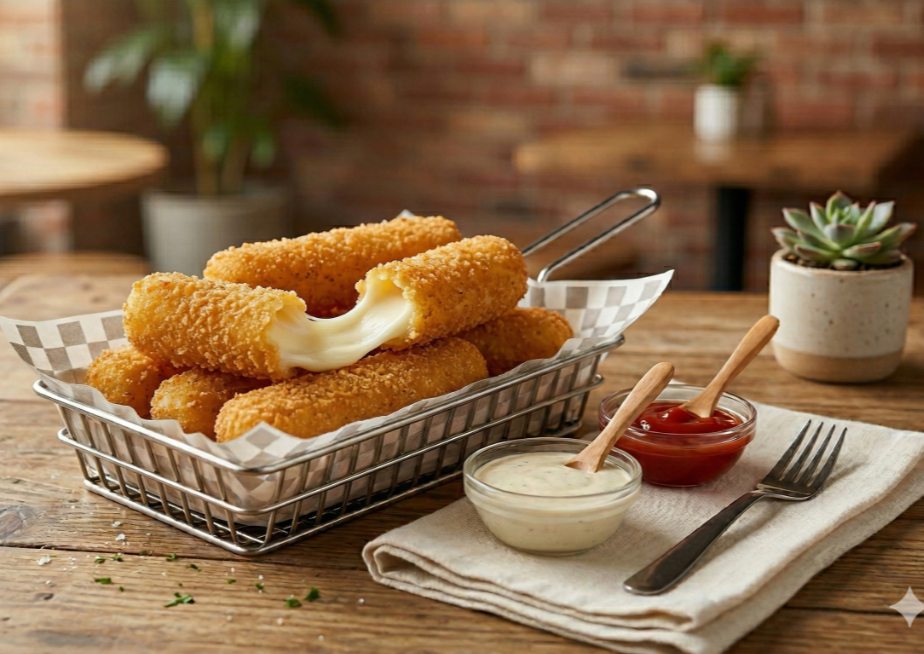5 Piezas de palitos de queso mozzarella empanizados con salsa catsup.