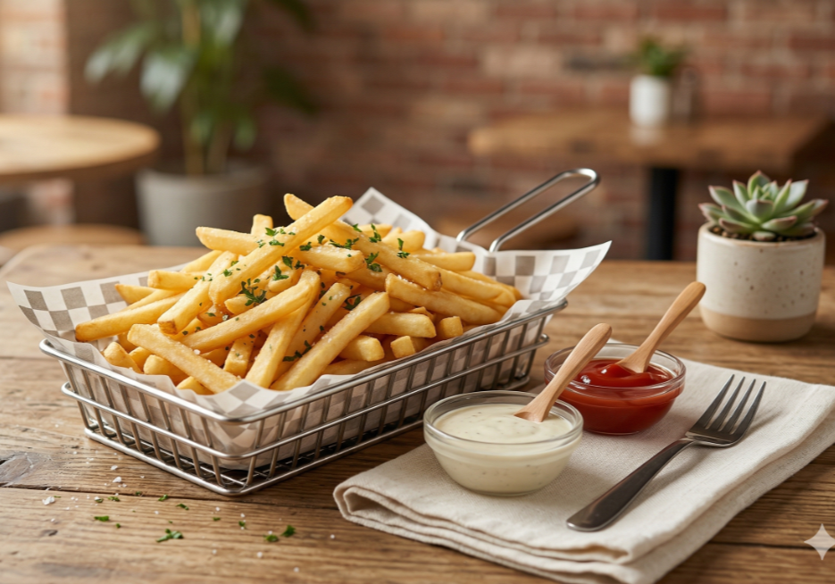250 Gramos de papas fritas clásicas acompañadas con catsup.