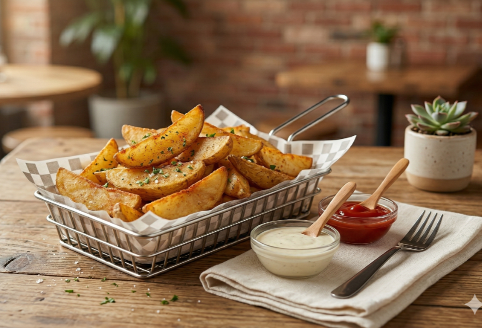 250 Gramos de papas sazonadas tipo gajo servidas con queso amarillo.