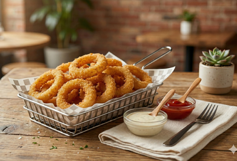 10 Aros de cebolla crujientes servidos con aderezo ranch.