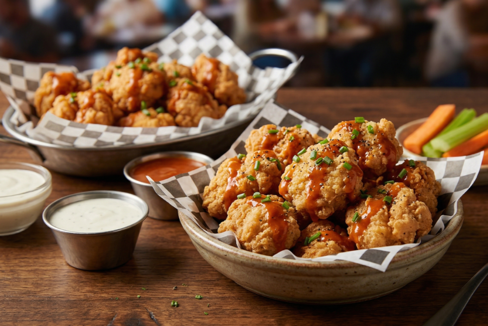 Media cubeta de boneless ideales para compartir. Incluyen ranch y zanahoria.