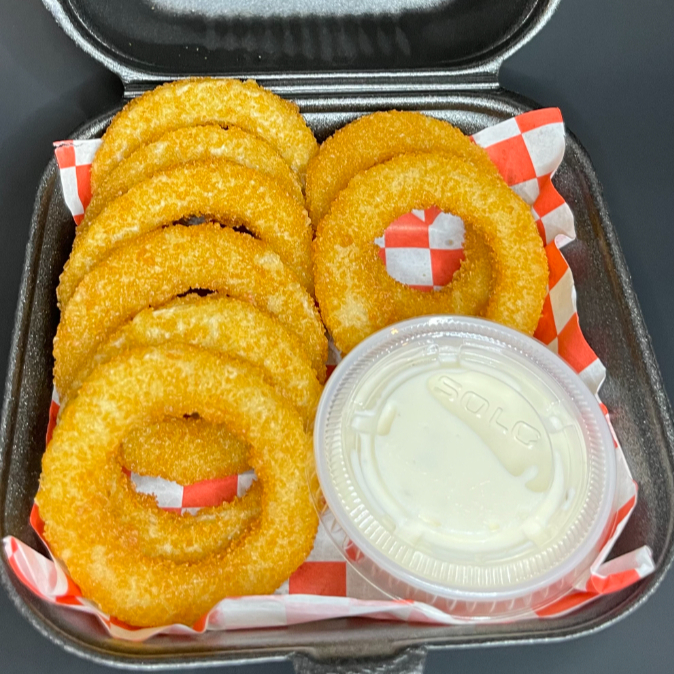 Crujientes aros de cebolla servidos en media orden (6 piezas). Acompañados de ranch.
