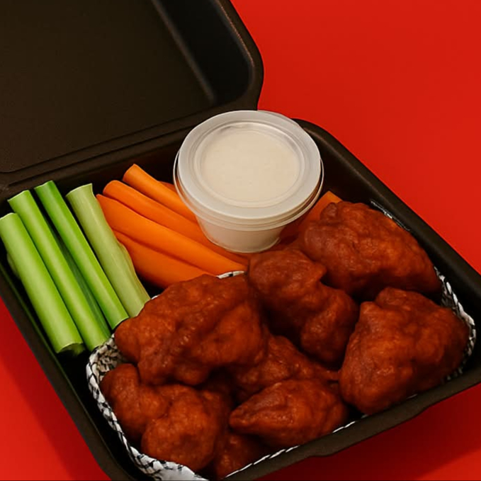Deliciosos trozos de pollo empanizado, bañados en tu salsa favorita. Incluye 1 aderezo ranch y vegetales frescos.
