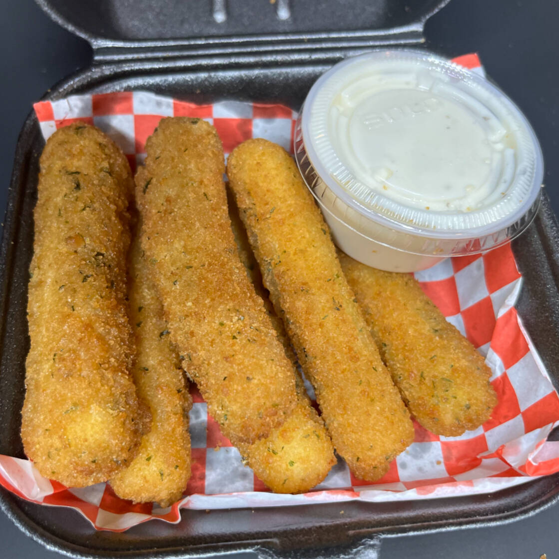 6 Deliciosos dedos de queso empanizados y dorados hasta quedar crujientes por fuera y cremosos por dentro acompañados con aderezo ranch.