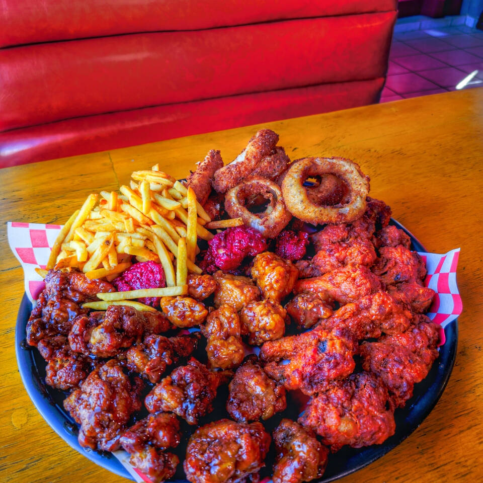 24 alitas, 1 orden de papas(400G), 1 orden de Aros(10pz), 1 orden de dedos de queso (6pz), 1 orden de bonless (600G)