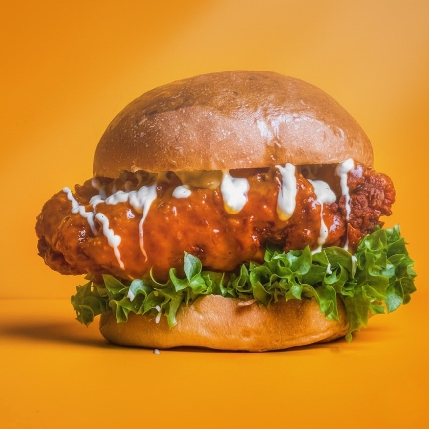 Pan hecho en casa, pechuga de pollo frita bañada en salsa buffalo, queso country, aderezo ranch, lechuga y tomate, acompañada de papas