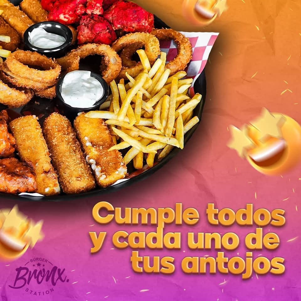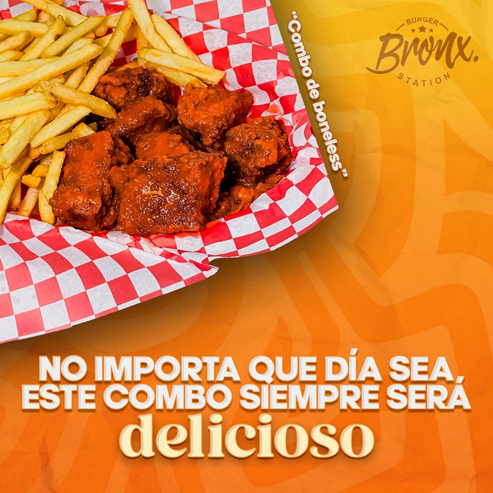 1 orden de bonless (600G), 1 orden de papas(400G), 1 orden de Aros (10pz), 1 orden de dedos de queso(6pz)
