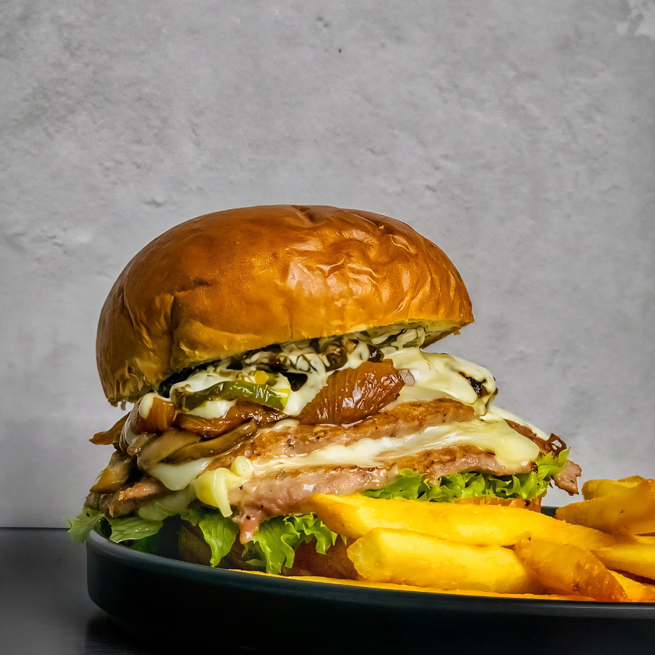Pan hecho en casa, 200G de carne, champiñones salteados, aderezo chipotle, lechuga y tomate, acomañada de papas