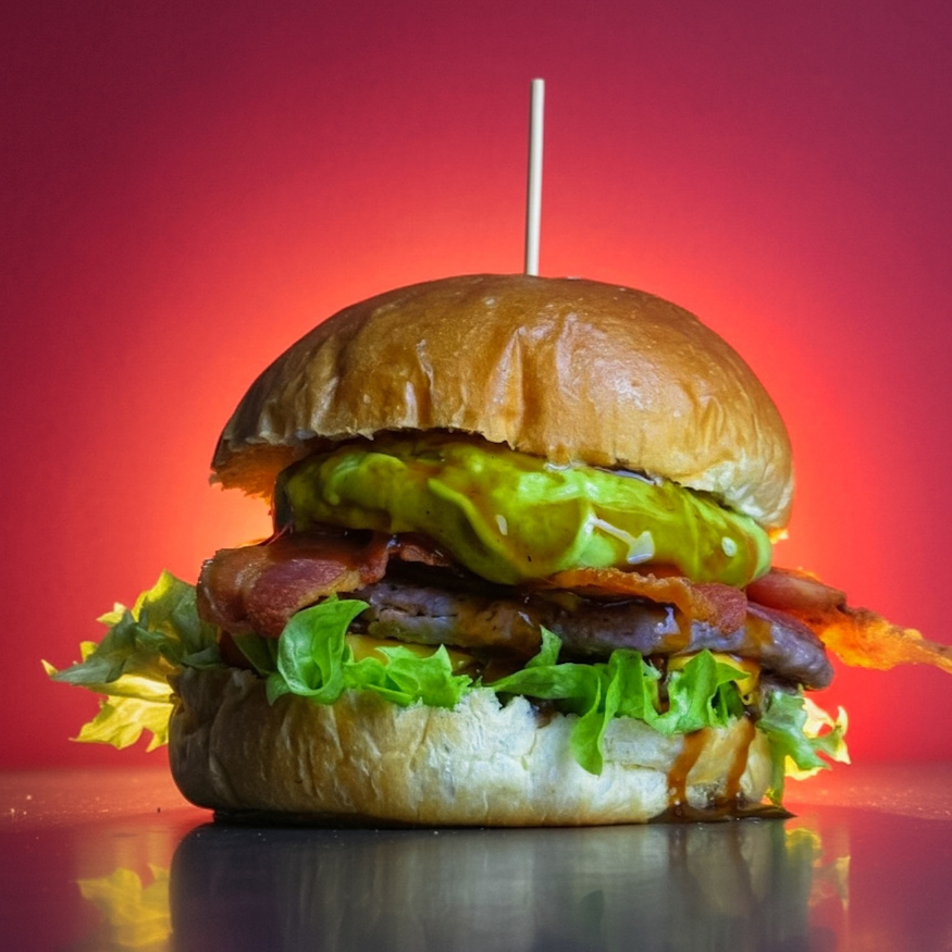 Pan hecho en casa, 200G de carne, tocino, queso country, guacamole, lechuga y tomate, acompañada de papas.