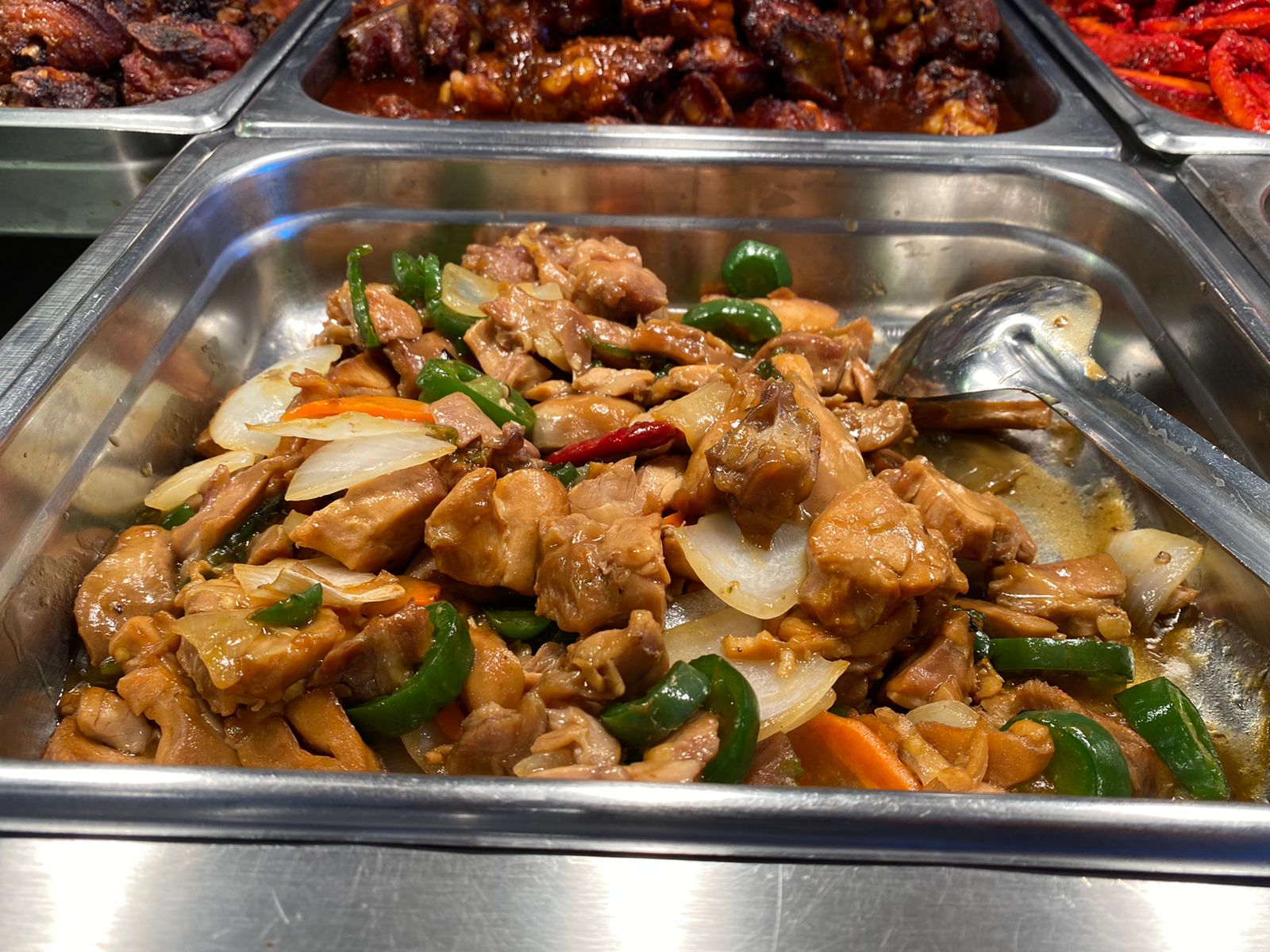 Combo personal, Incluye una guarnición (Arroz o Spaguetti) + 3 Guisos a tu elección (va empacado en un contenedor de 8x8 cm), salsa soya y tiracha