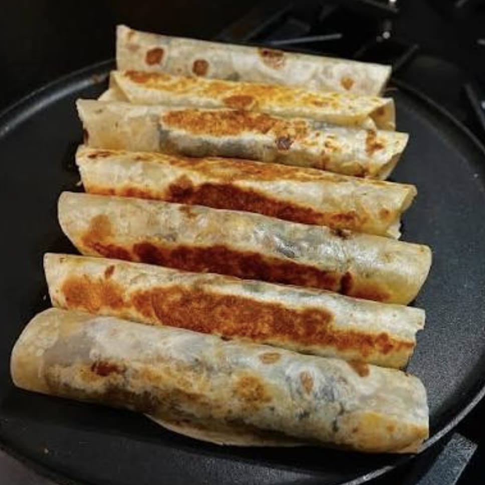 Tortilla de harina con queso fundido y chorizo con papas.