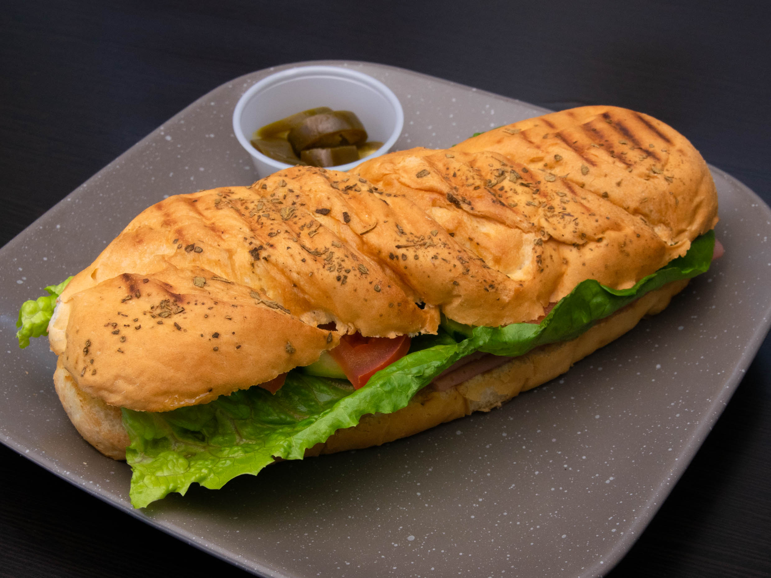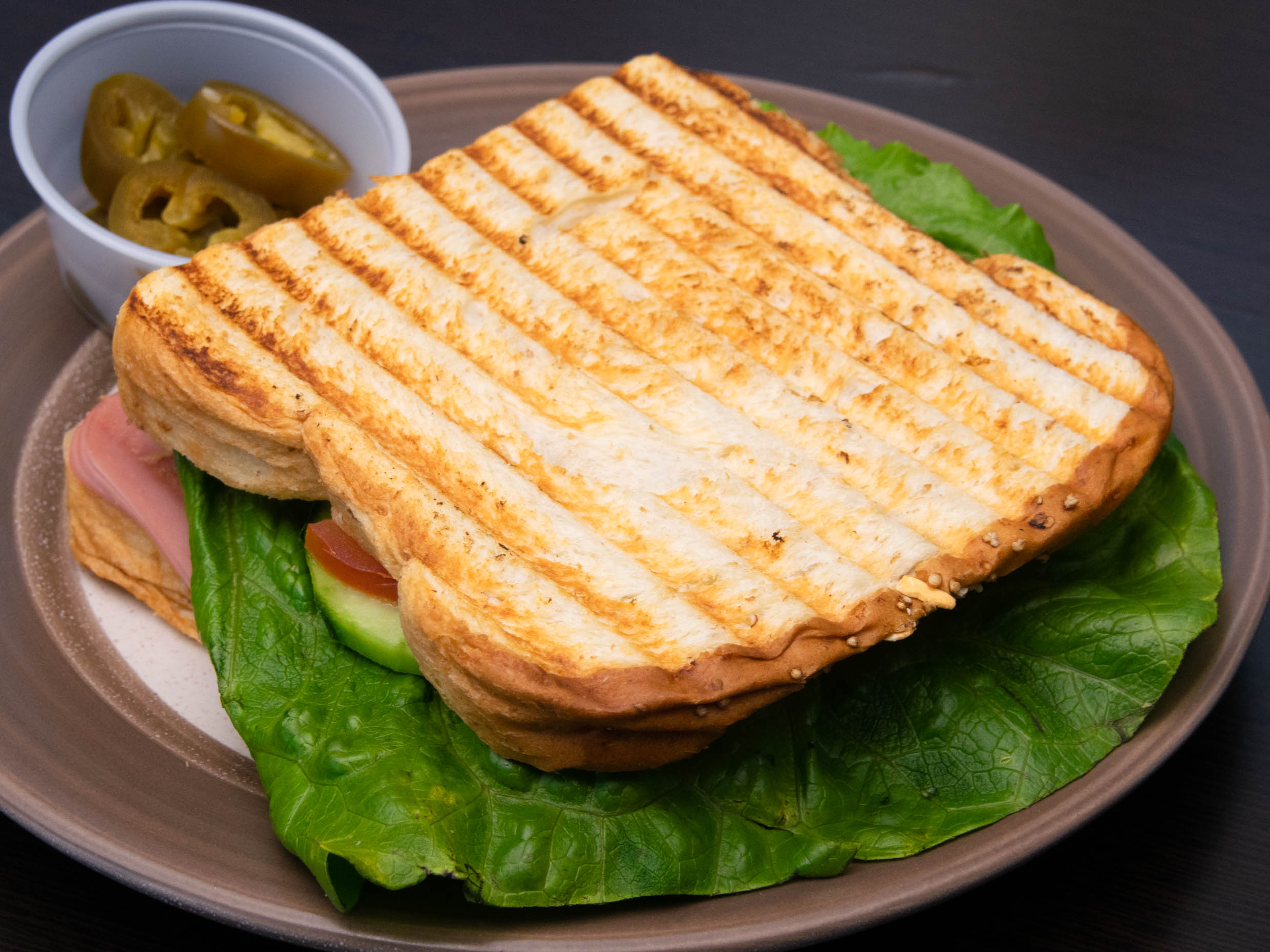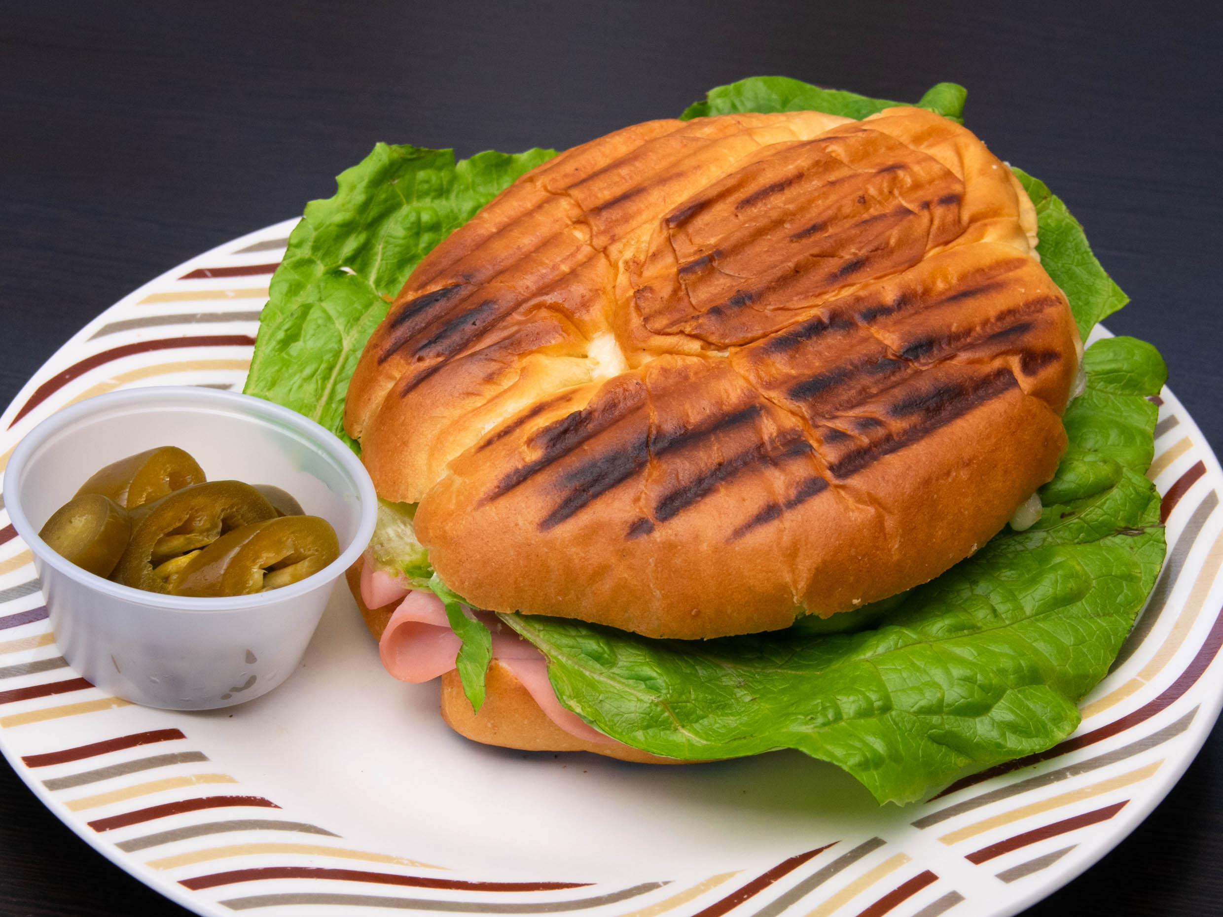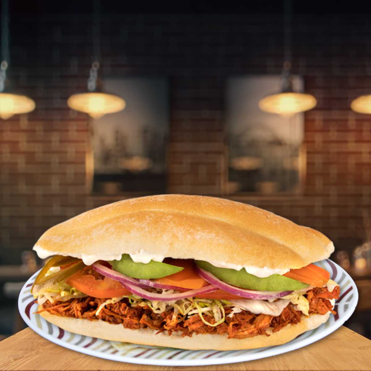 Jamon, lechuga, tomate, aguacate, crema y moztaza