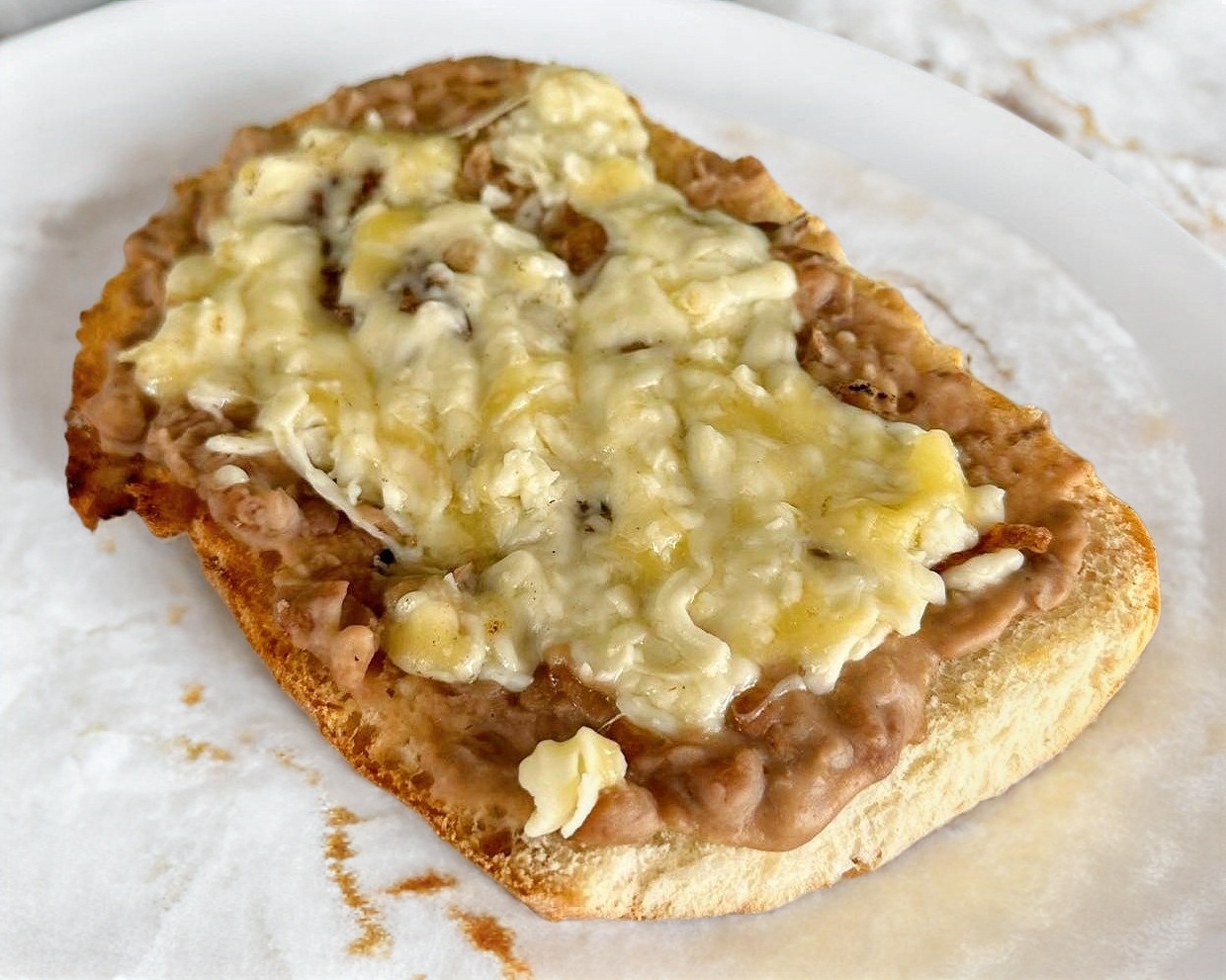 Media teleracon frijo y queso blanco gratinado. Incluye aparte a elegir crema, aderezo de chipotle y salsa.