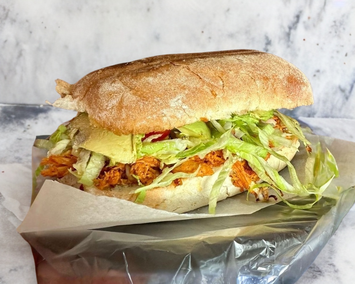 Pan baguette con mayonesa, mostaza, pechuga de pollo a la plancha BBQ o natural, queso blanco gratinado, lechuga, tomate y aguacate. Incluye aparte a elegir crema, aderezo de chipotle y chiles jalapeños.