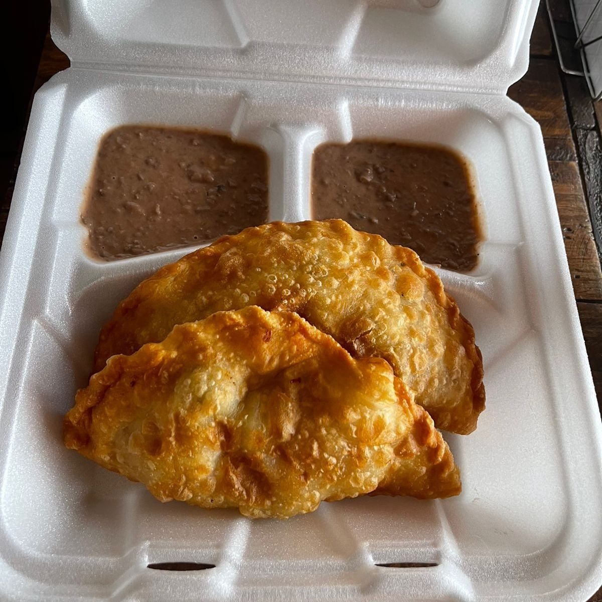 Dos empanadas de carne acompañadas de frijol. Incluye aparte a elegir crema, aderezo de chipotle y salsas.