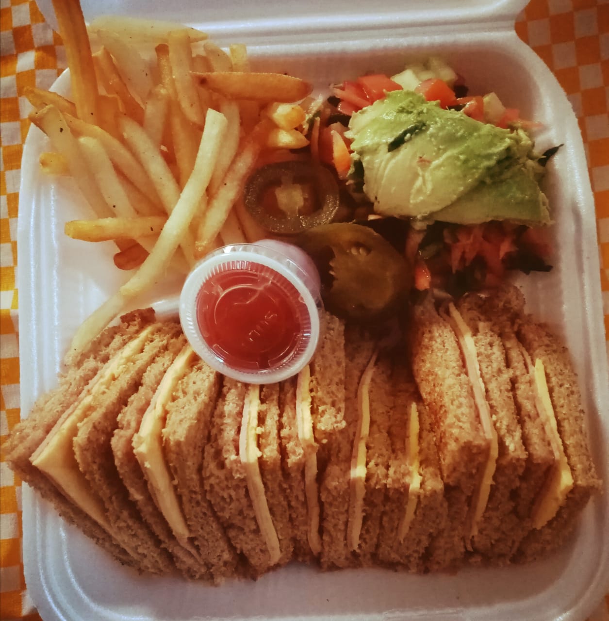 PAN INTEGRAL CON JAMON DE PAVO Y QUESO AMARILLO,ACOMPAÑADO DE PAPAS FRITAS Y ENSALADA VERDE