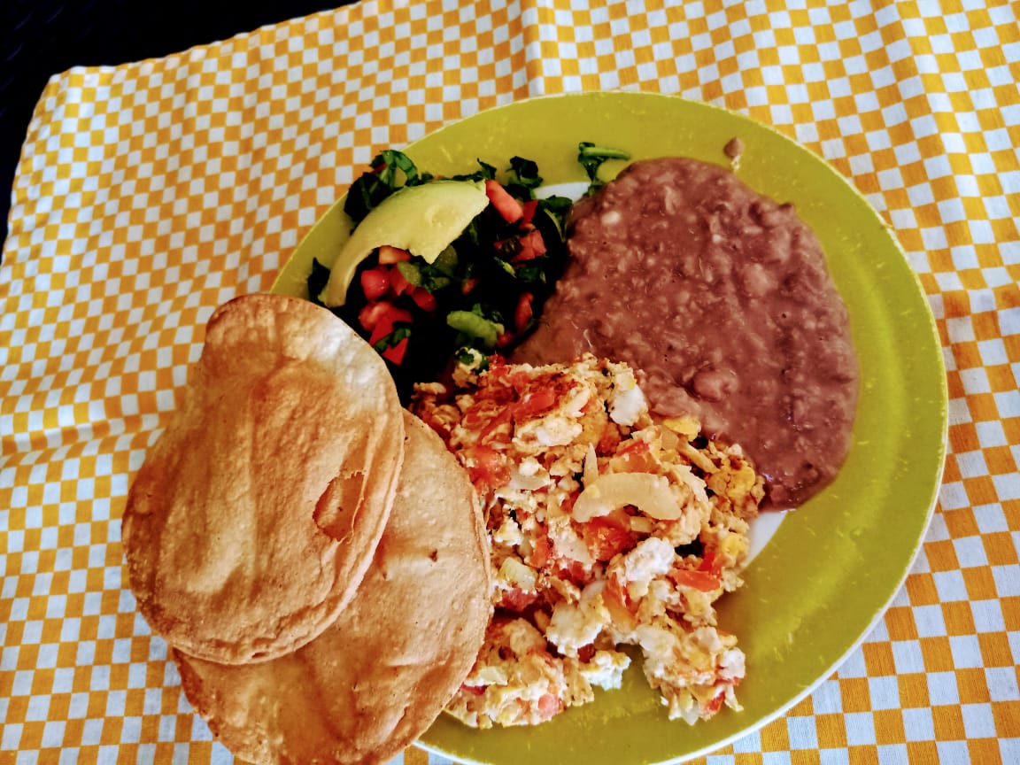 Huevo con tomate, cebolla y chile, queso panela o Chihuahua, acompañado de 3 tortillas de maíz o harina con ensalada verde y frijol.