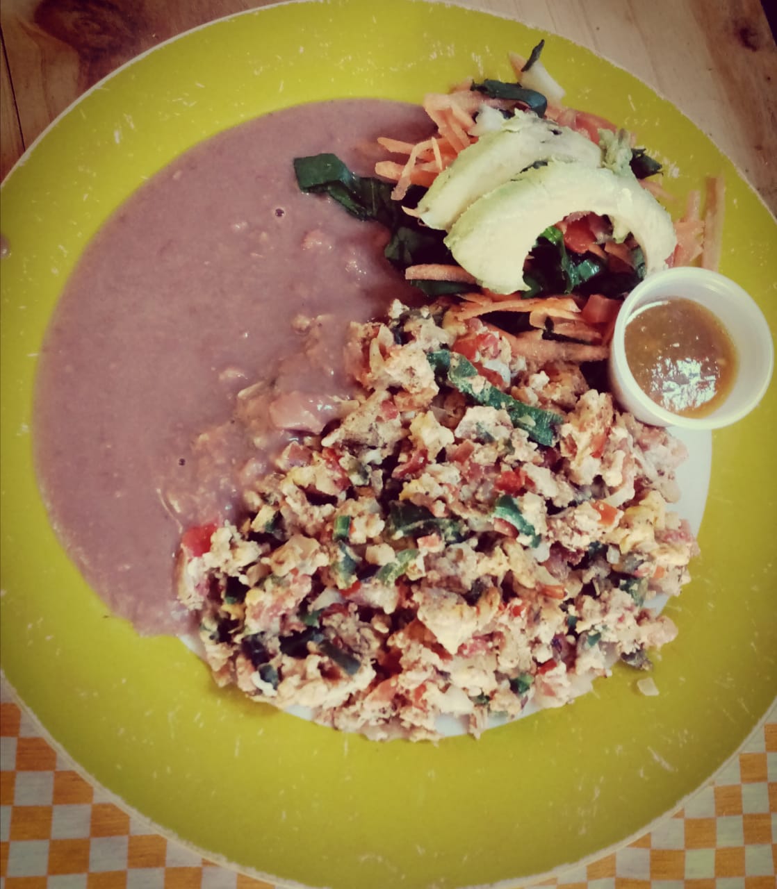Huevo revuelto con 1 ingrediente, acompañado de ensalada verde y frijol, 3 tortillas de maíz o harina.