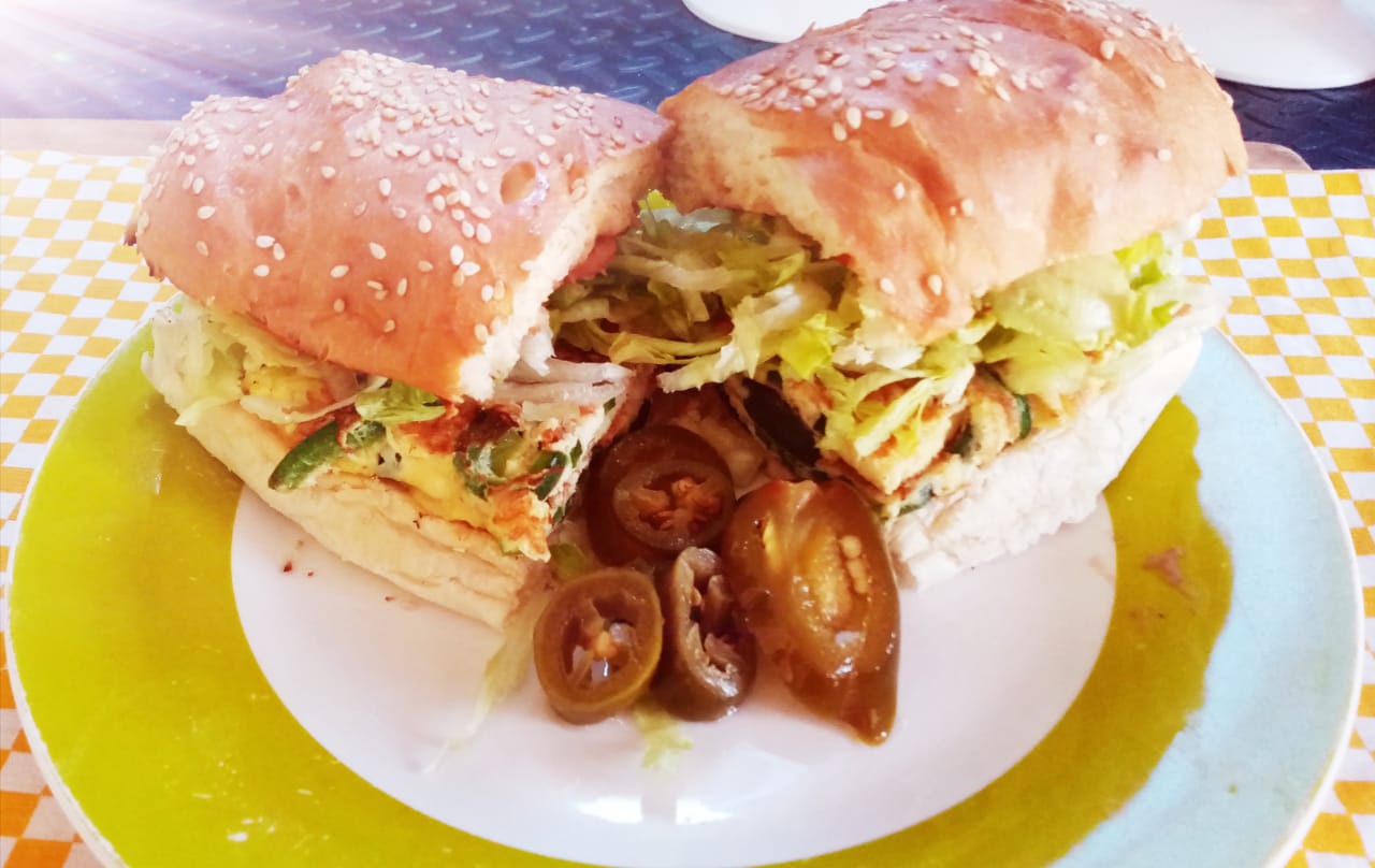 Telera de huevo, lechuga, tomate, aguacate, mayonesa y mostaza.