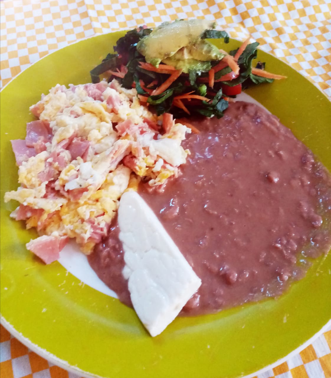 Huevo con jamón ,queso panela o Chihuahua, acompañado 3 tortillas de maíz o harina con ensalada verde y frijol.