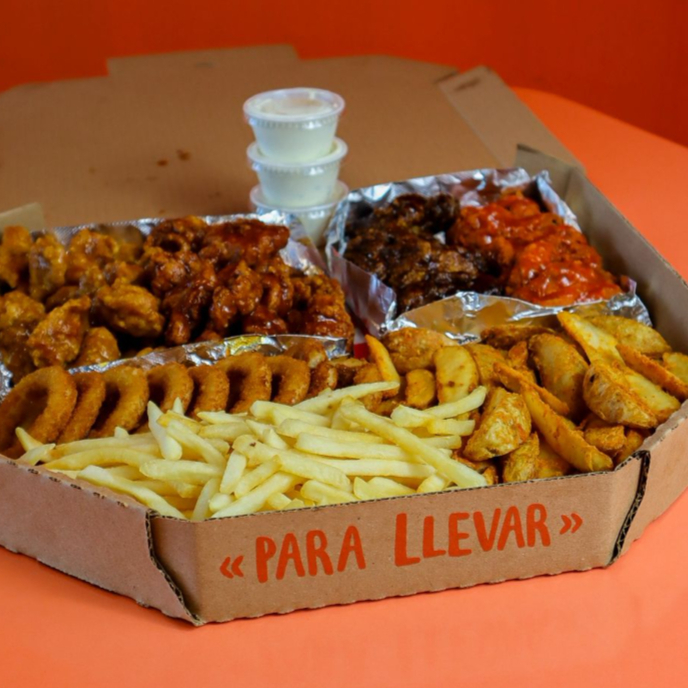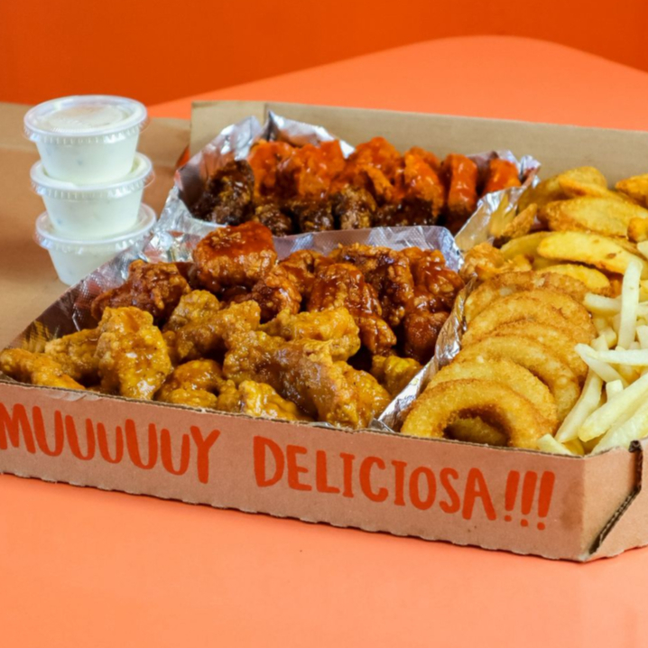 Incluye 24 alitas, 1kg de boneless con salsa a escoger, acompañado de 10 aros de cebolla y papas a la francesa.