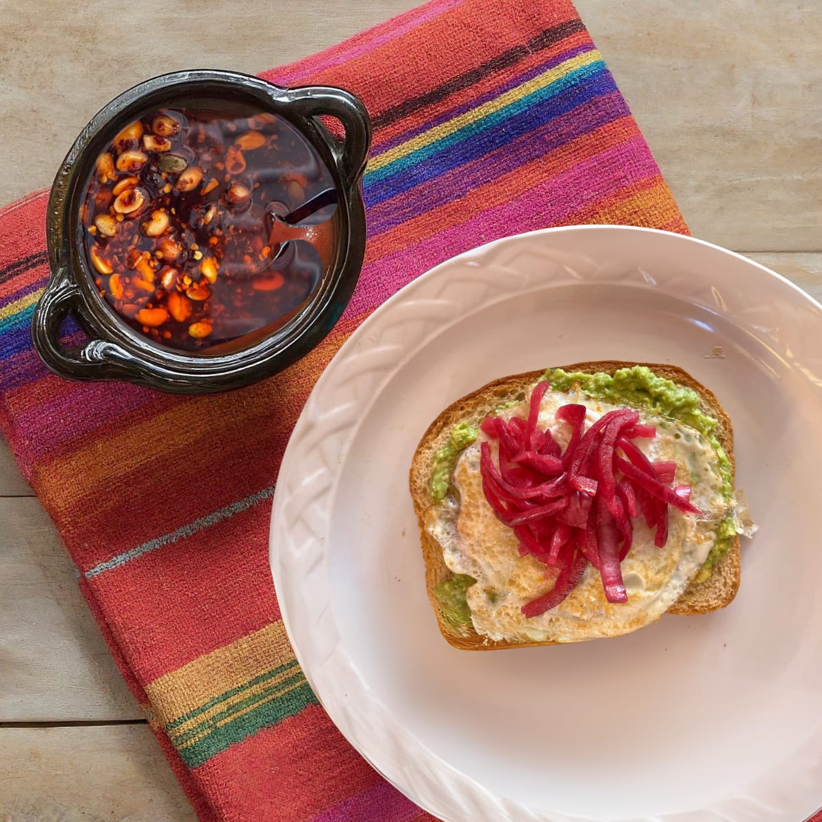 Huevitos estrellados en una base de pan con guacamole, ensalada y salsa macha
