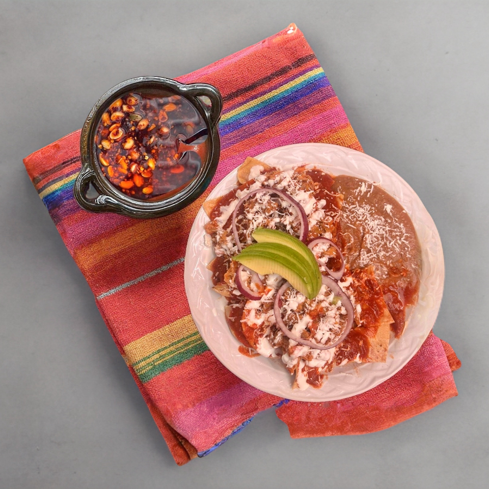 De carne deshebrada, con cebolla curtida, aguacate, crema, queso cotija acompañados de frijolitos, y salsa macha.