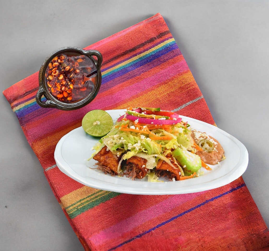 Acompañado con ensalada, salsa macha y aderezo de jalapeño especial. Se acompaña con frijolitos, a partir de dos piezas..