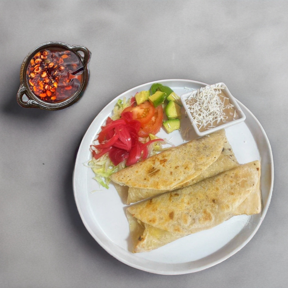 Tortilla de harina hecha a mano, vegetales, salsa macha y aderezo de jalapeño especial. Se acompaña con frijolitos, a partir de dos piezas.