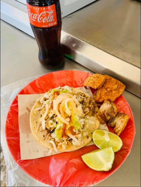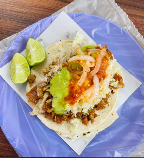 Rico taco de carnitas con doble tortilla acompañado de diversas salsas.