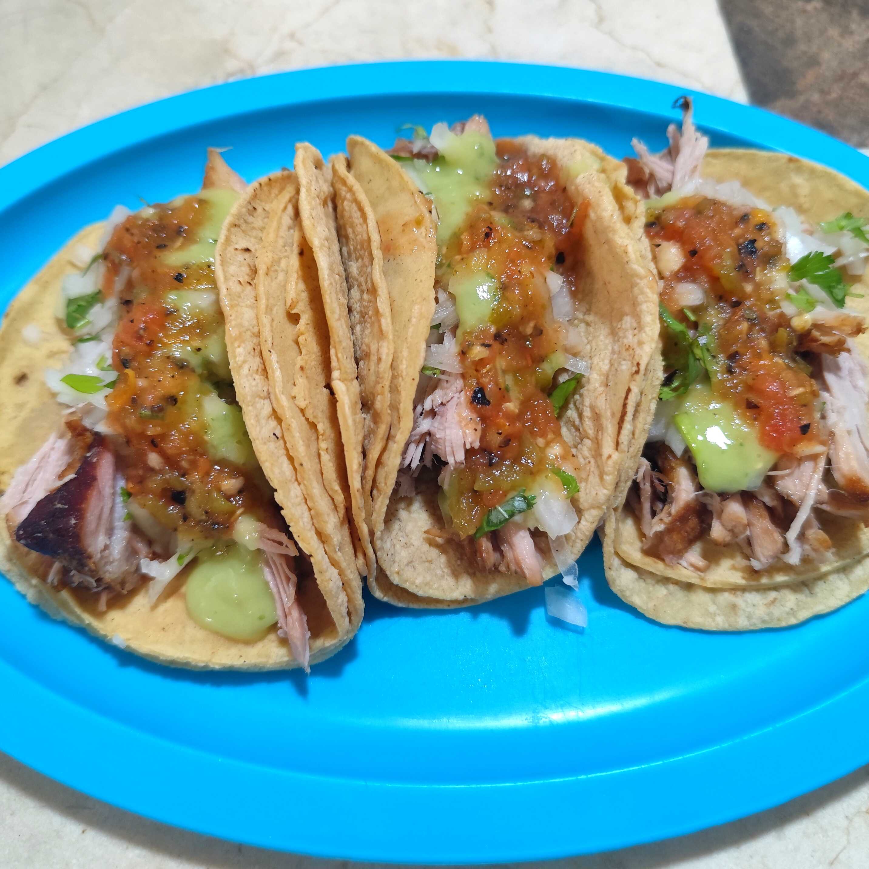 tacos de carnita de puerco, salsita roja, guacamole, verdura y limones