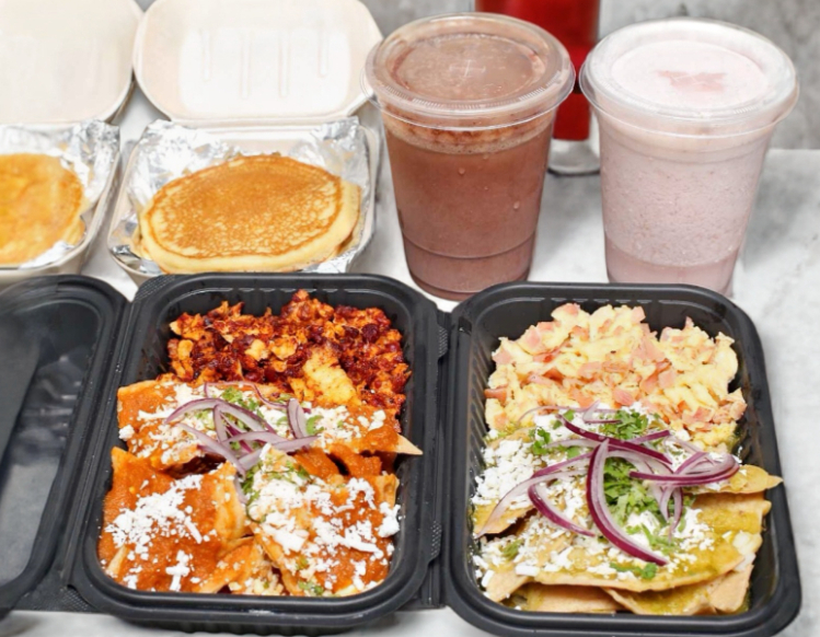 Huevos revueltos con ingrediente a escoger: chorizo o jamon, chilaquiles verde o rojos, hot cakes y 2 licuados de medio litro cada 1