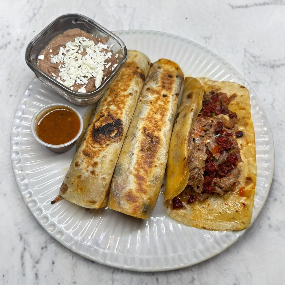 3 piezas acompañas de frijol, mexicana y salsa picosa