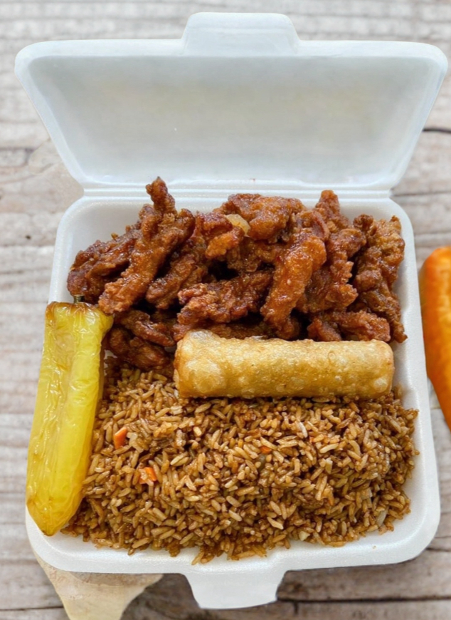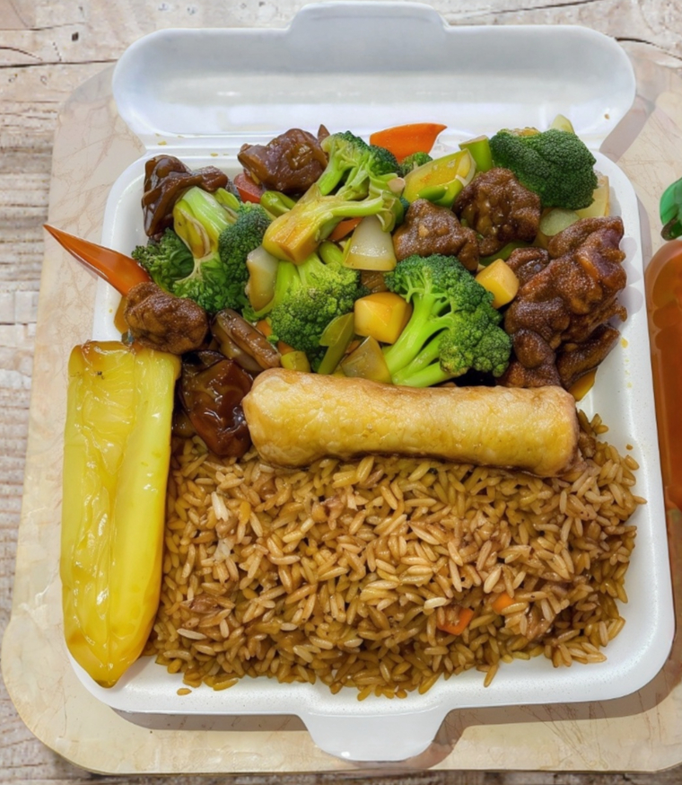Arroz cantones, res con brócoli, chun kun y chile güero, incluye una botella de té.