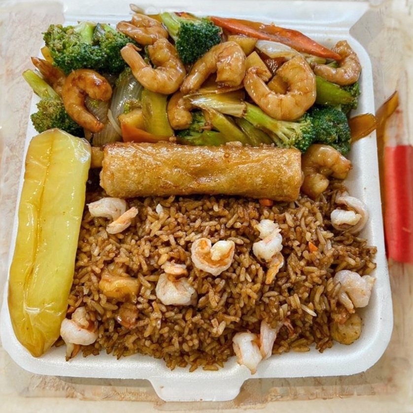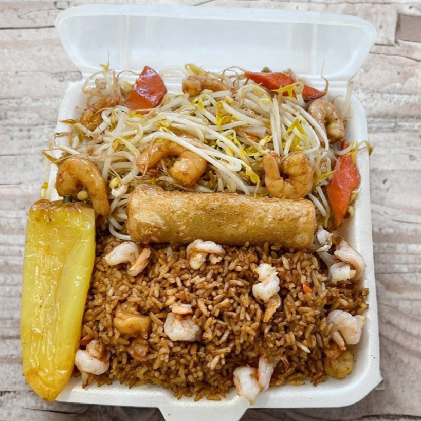 Arroz con camarón, chop suey con camarón, chun kun y chile güero, incluye una botella de té.