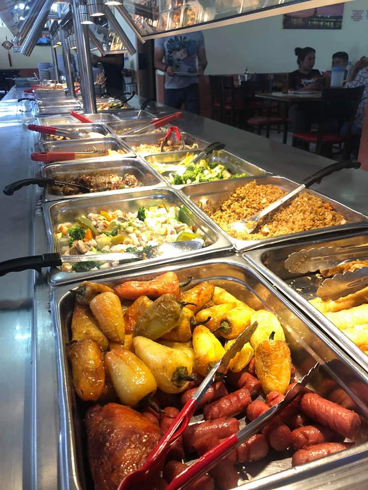 1 litro de té, Arroz cantones, carnitas coloradas, chop suey de pollo, pollo con piña, pollo frito y chun kun.