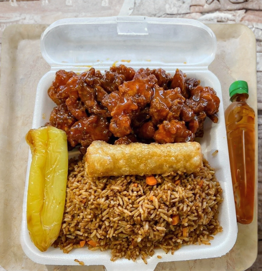 1 litro de té, arroz cantones, carnitas coloradas, res con brócoli, combinación china, chop suey de pollo y pollo kung pao.