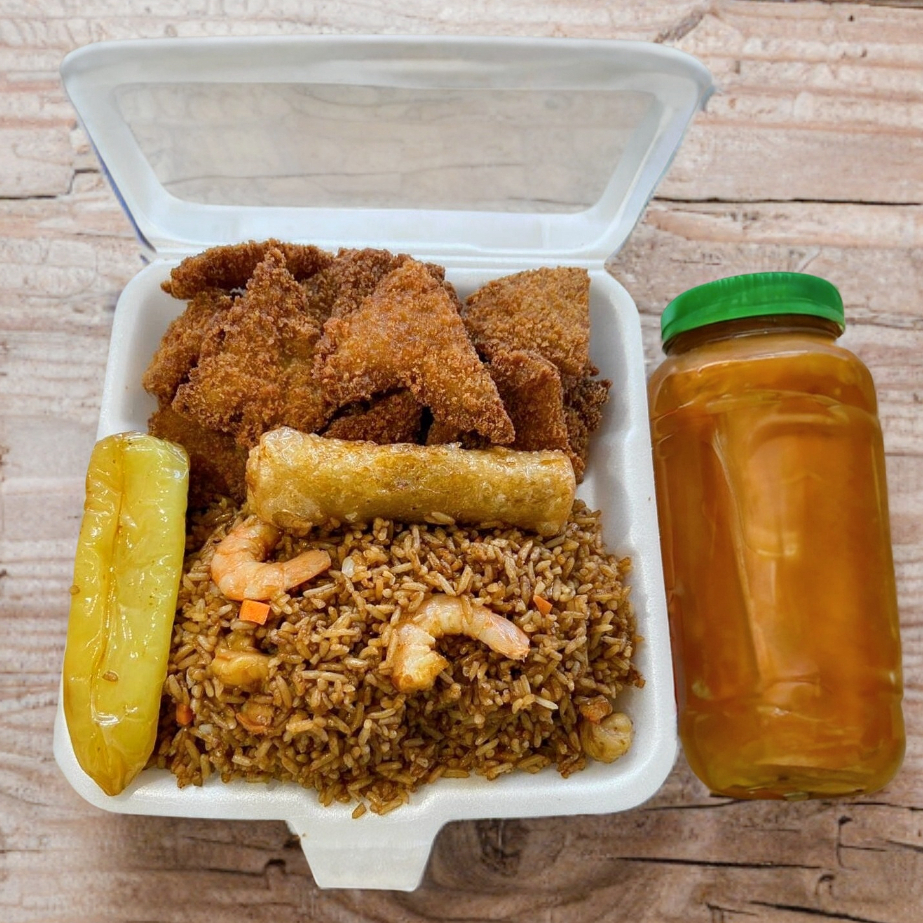 Arroz con camarón, pescado empanizado, chun kun y chile güero, incluye una botella de té.