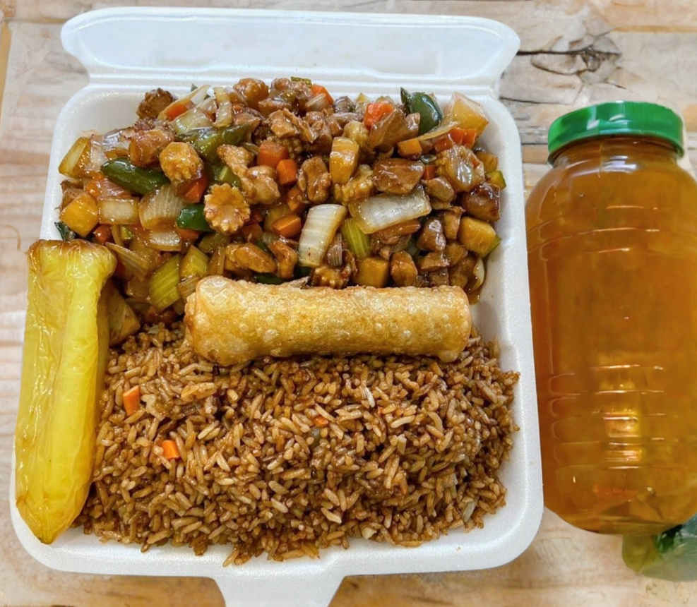 Arroz cantones, pollo con piña, chun kun y chile güero, incluye botella de té.