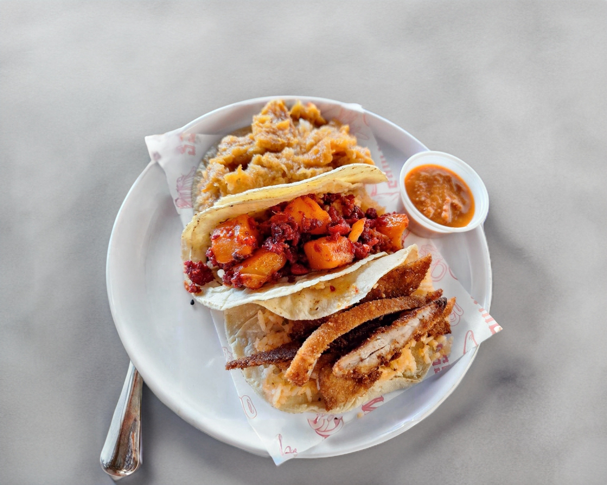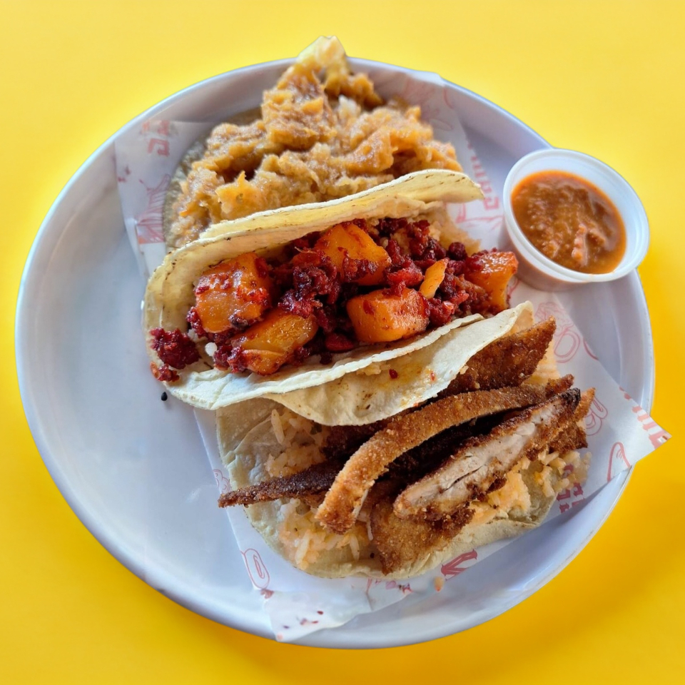 Combo de 3 Tacos (Milaneza, Chirizocon Papas y Chicharron en Salsa) todos con Arroz y doble Tortilla