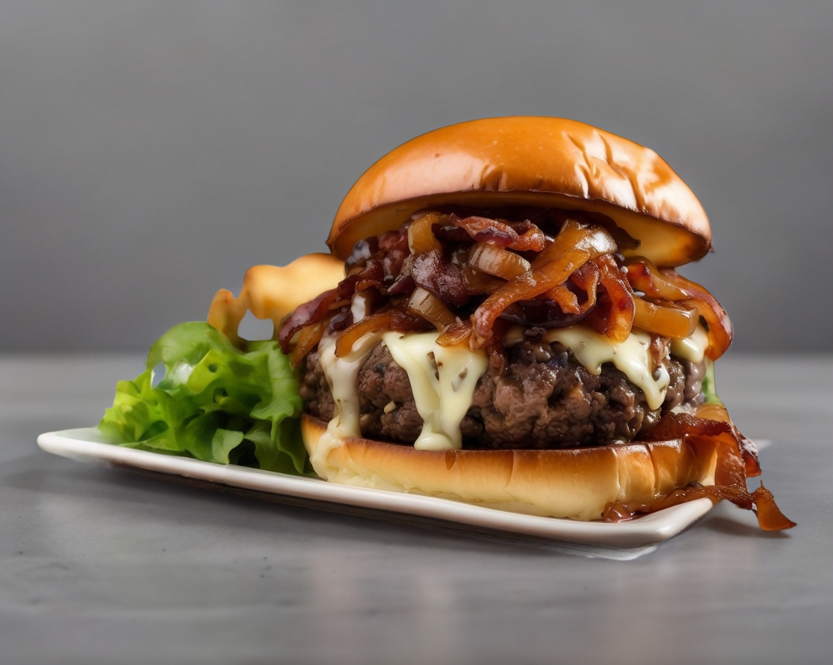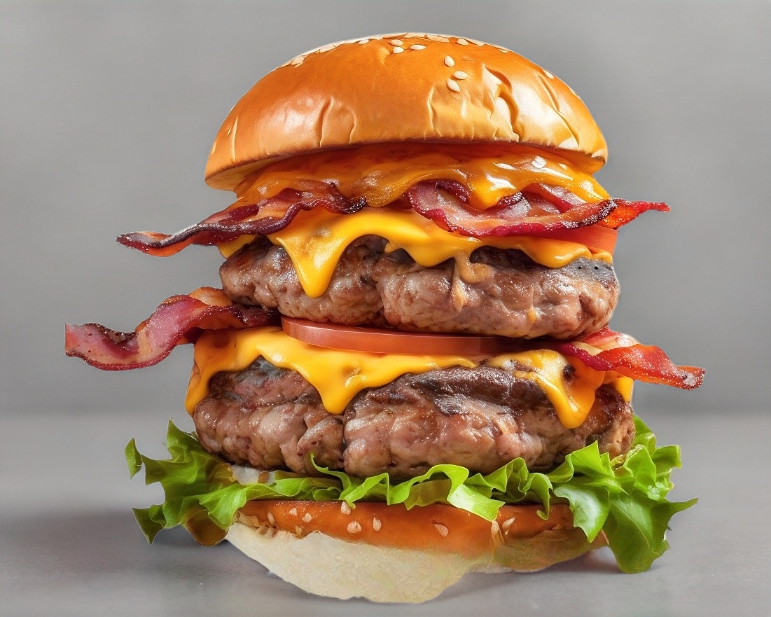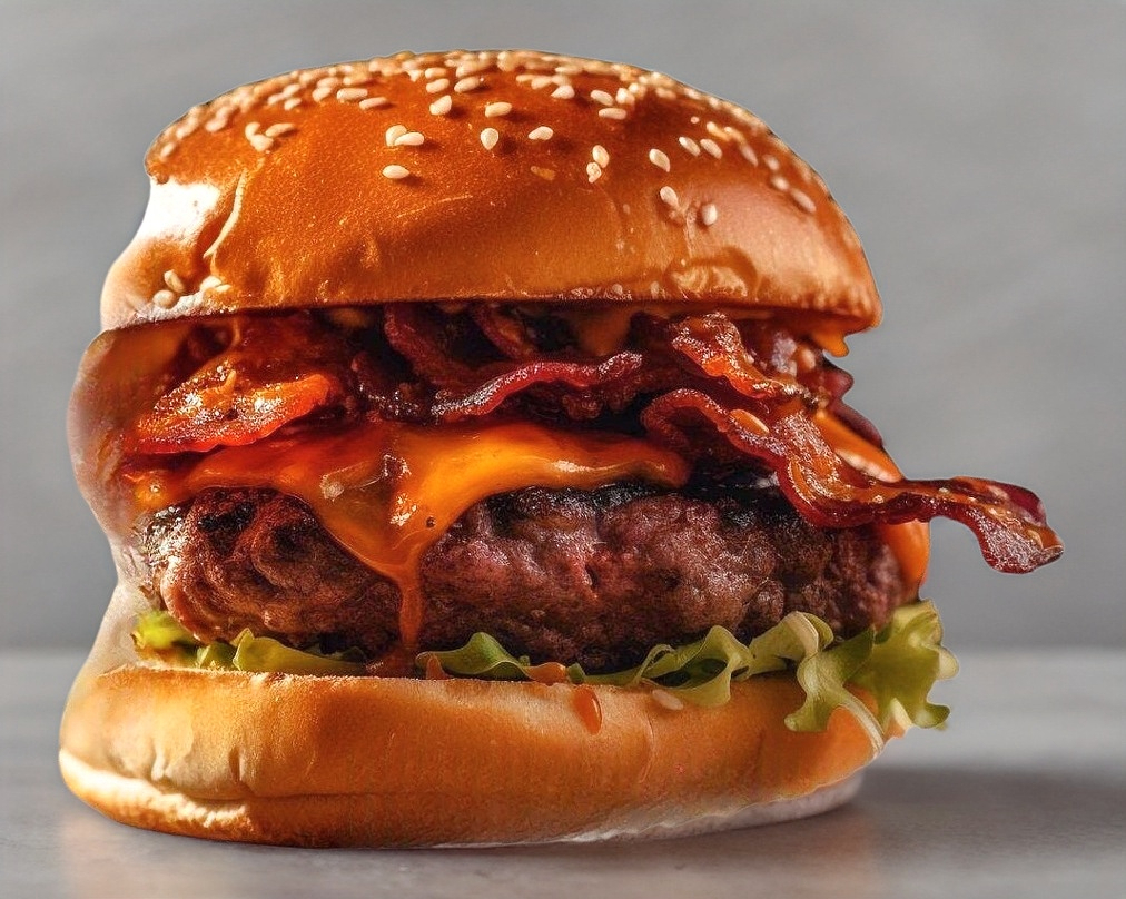 Jugosa Carne de Res (300gr), Queso Amarillo, Queso Manchego, Tocino, Jitomate, Cebolla y Lechuga; Acompañada de un Chile Güero y Papas a la Francesa