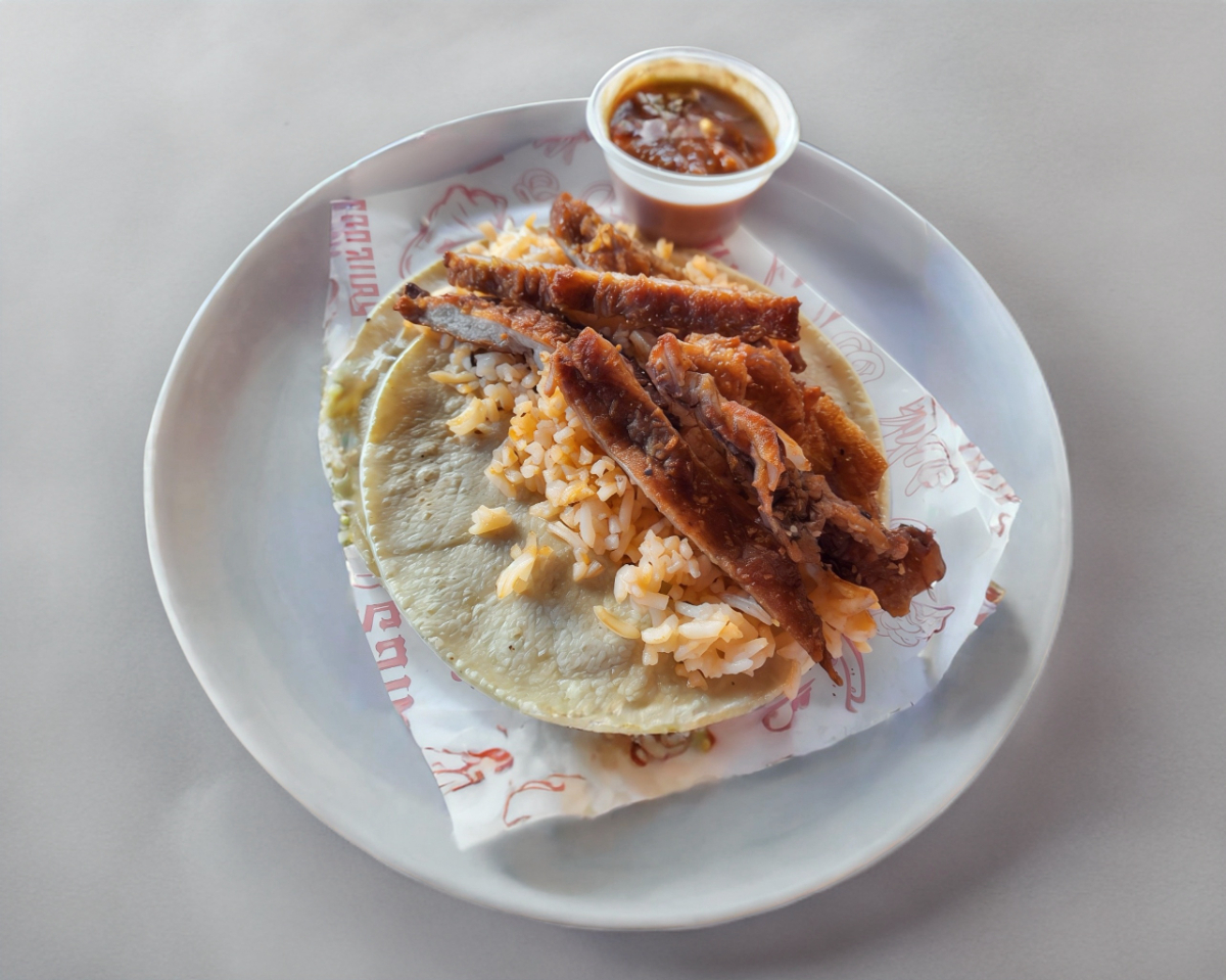 Taco de guidado de Chicharron en Salsa, con Arroz (Doble tortilla de Maiz)
