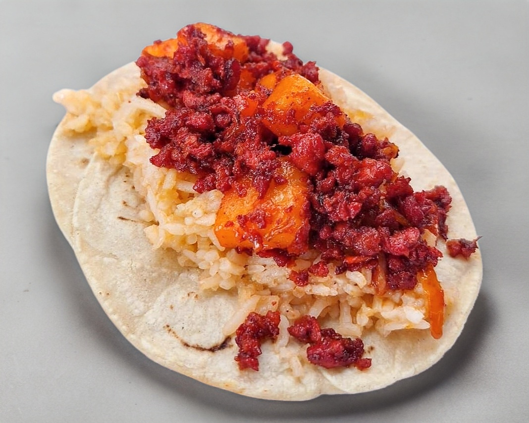 Taco Grande de Chicharron en Salsa Roja con Arroz