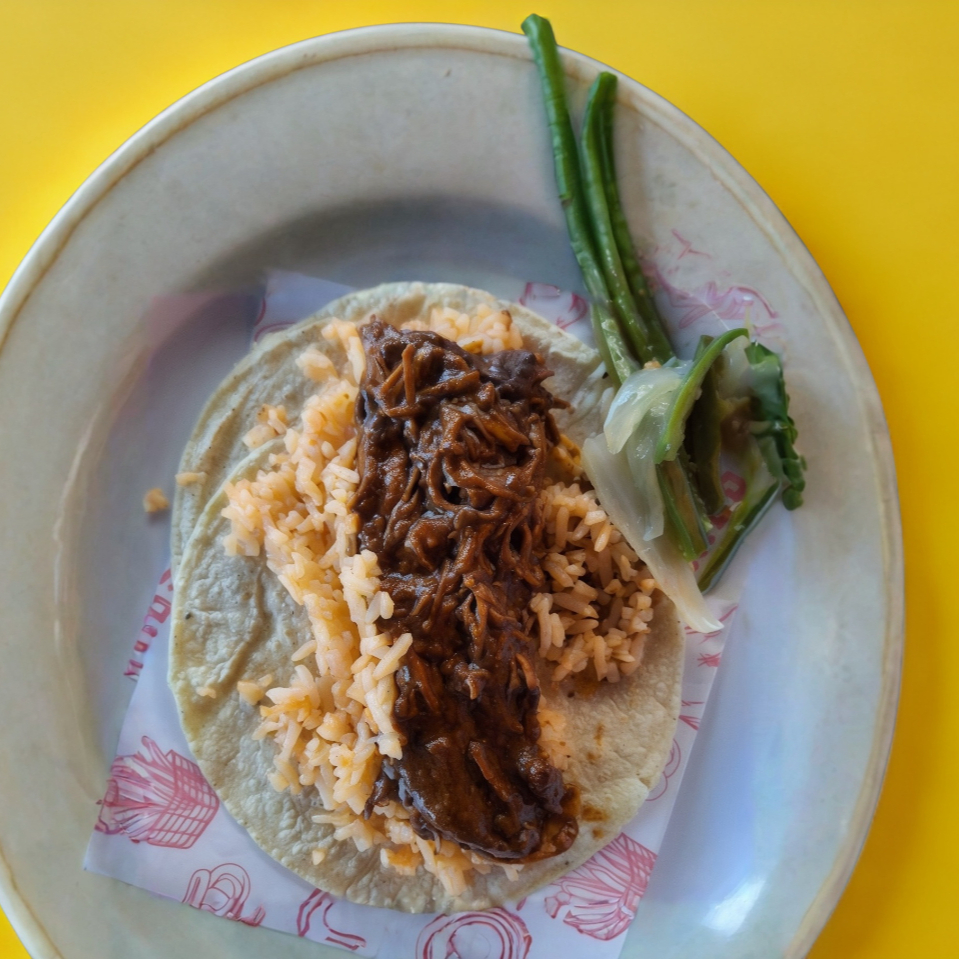 Taco de Mole con Pollo y Arroz, delicioso (Doble tortilla e maiz, tamaño Normal)