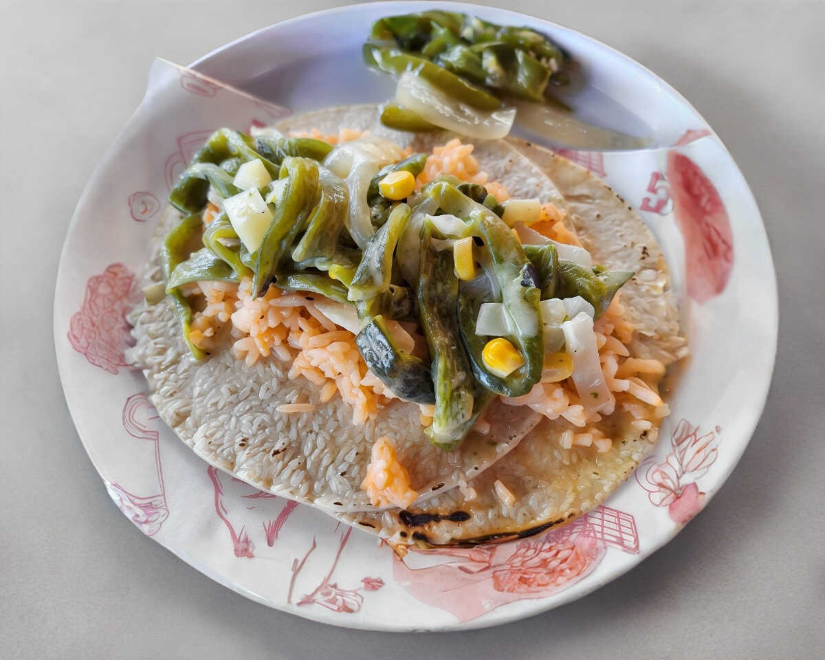 Taco de Deliciosas Rajas con Crema, Pollo y Arroz. (Doble tortilla de maiz Normal)