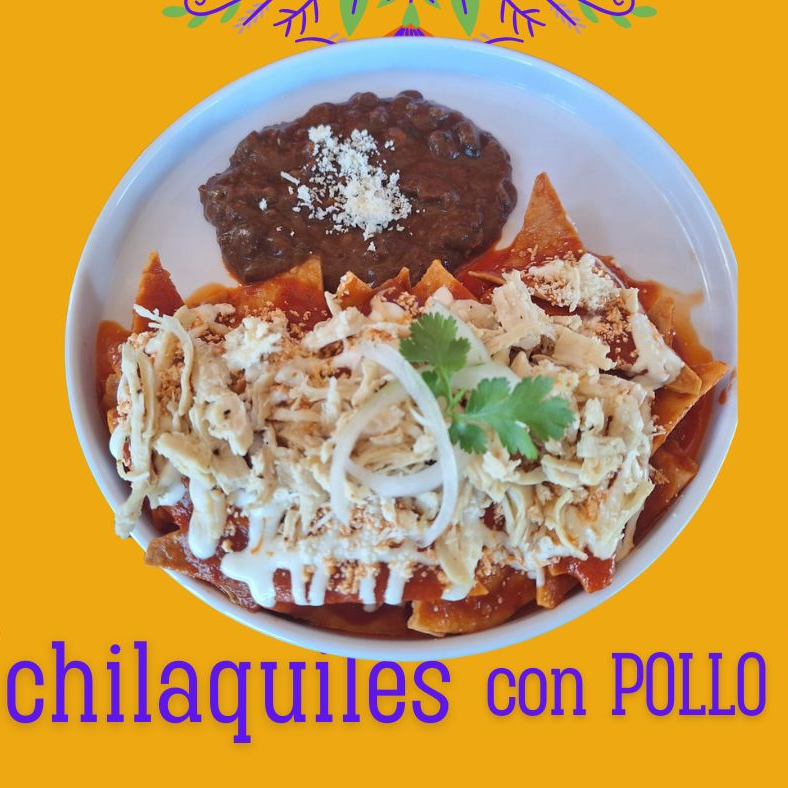 Ricos Chilaquiles con 150gr de Pollo, Frijolitos y Pan. Ud puede elejir entre Salsa Roja o Verde