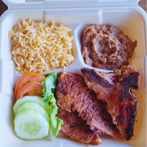 Chuleta ahumada (100grs), Porcion de Arroz, Frijoles y 4 Tortillas de Maiz